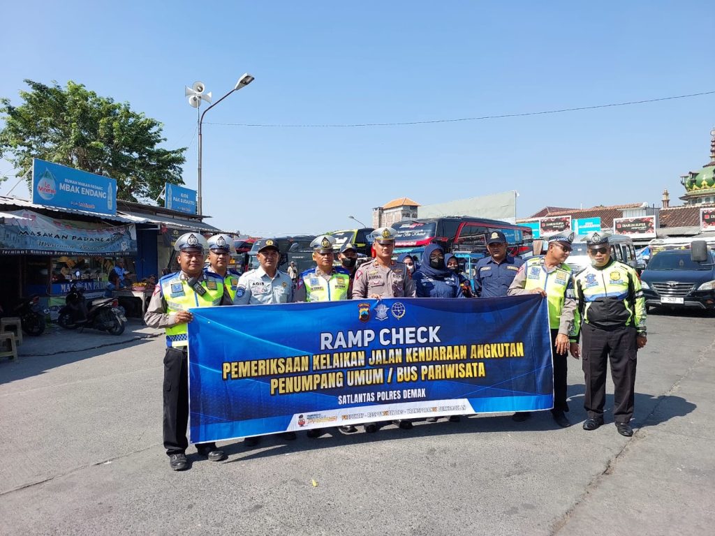 DEMAK – Untuk meminimalkan risiko kecelakaan, Dinas Perhubungan Kabupaten Demak bersama Polres Demak, Jasa Raharja, dan , melakukan pemeriksaan kelaikan (ramp check) kendaraan pariwisata (bus) yang sedang berhenti di area parkir Pariwisata Kadilangu. (19/5/2024)