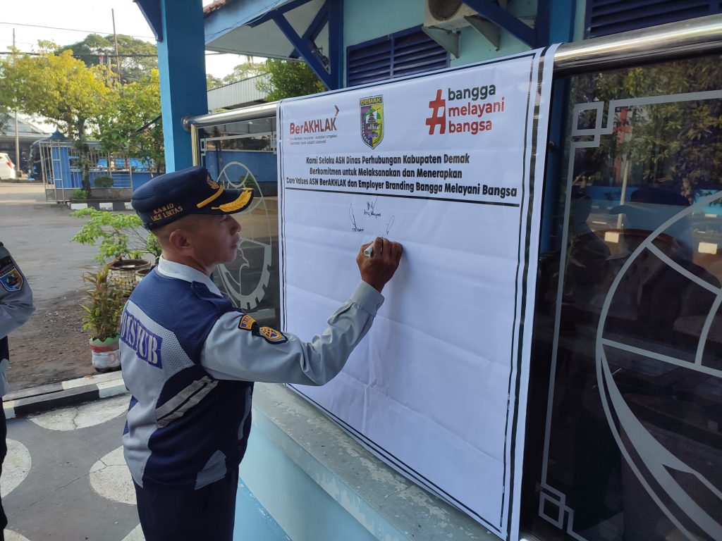 Demak, 23 Juni 2025 — Dalam rangka mendukung penguatan budaya kerja aparatur sipil negara, Pada hari Senin Pukul 07.30 WIB BDinas Perhubungan Kabupaten Demak melaksanakan kegiatan penandatanganan komitmen pelaksanaan dan penerapan Core Values ASN “BerAKHLAK” dengan Employer Branding “Bangga Melayani Bangsa”. Kegiatan ini dilaksanakan di halaman kantor Dinhub dan diikuti oleh seluruh ASN yang bekerja.. Seluruh ASN melakukan penandatanganan secara langsung sebagai wujud pernyataan komitmen dan tanggung jawab moral terhadap nilai-nilai dasar ASN yang telah ditetapkan oleh pemerintah.