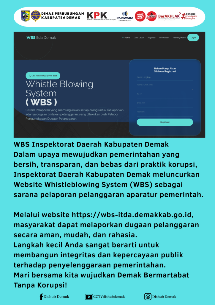 Dalam upaya mewujudkan pemerintahan yang bersih, transparan, dan bebas dari praktik korupsi, Inspektorat Daerah Kabupaten Demak meluncurkan Website Whistleblowing System (WBS) sebagai sarana pelaporan pelanggaran aparatur pemerintah.