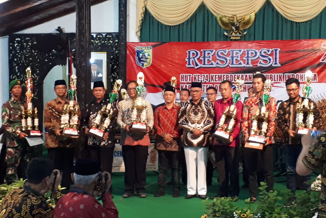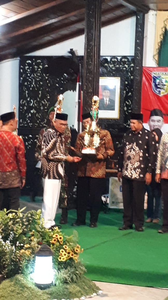 Piala dan penghargaan diserahkan oleh Bapak Bupati H.M Natsir kepada sekretaris dinas Perhubungan Kab. demak Drs. Suharto dalam acara resepsi HUT kemerdekaan RI yang ke 74 di pendopo Kab. Demak.