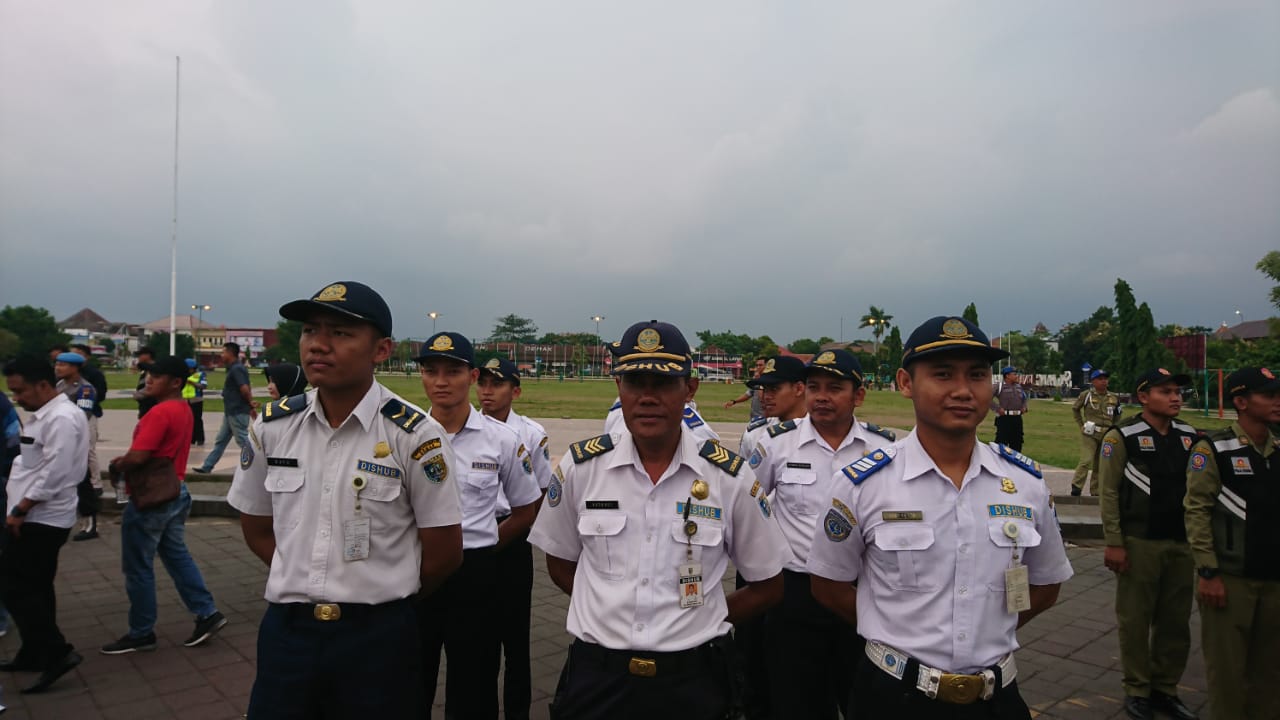 Personil gabungan dari dISHUB, Polres Demak, Kodim 0716/Demak, Satpol PP, PMI dan unsur lainnya mengikuti apel kesiapan pengamanan perayaan tahun baru 2020 yang berlangsung di Alun-alun Simpang Enam Demak, Selasa (31/12/2019).