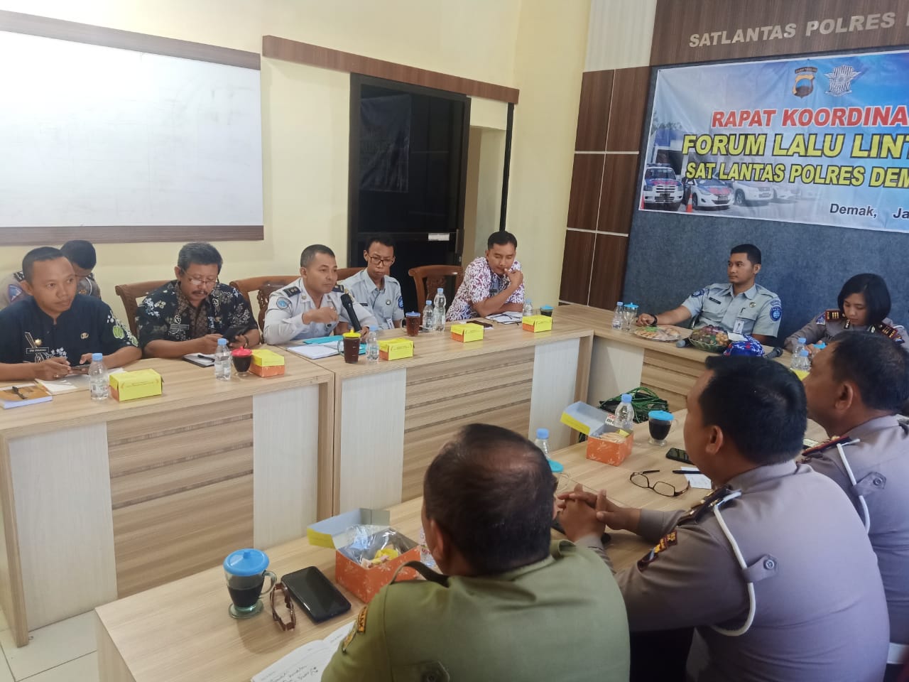 Rapat koordinasi Forum Lalu Lintas yang di selenggarakan oleh Polres Demak pd hari Rabu, 22-01-2020 pukul 09.00 WIB bertempat di Gedung Rupatama Satlantas Polres Demak yang dipimpin oleh Kasatlantas dan dihadiri oleh jajaran Satlantas Polres Demak, Jasa Raharja, DPUTARU, DISHUB, Satpol PP, dan DPMPTSP.