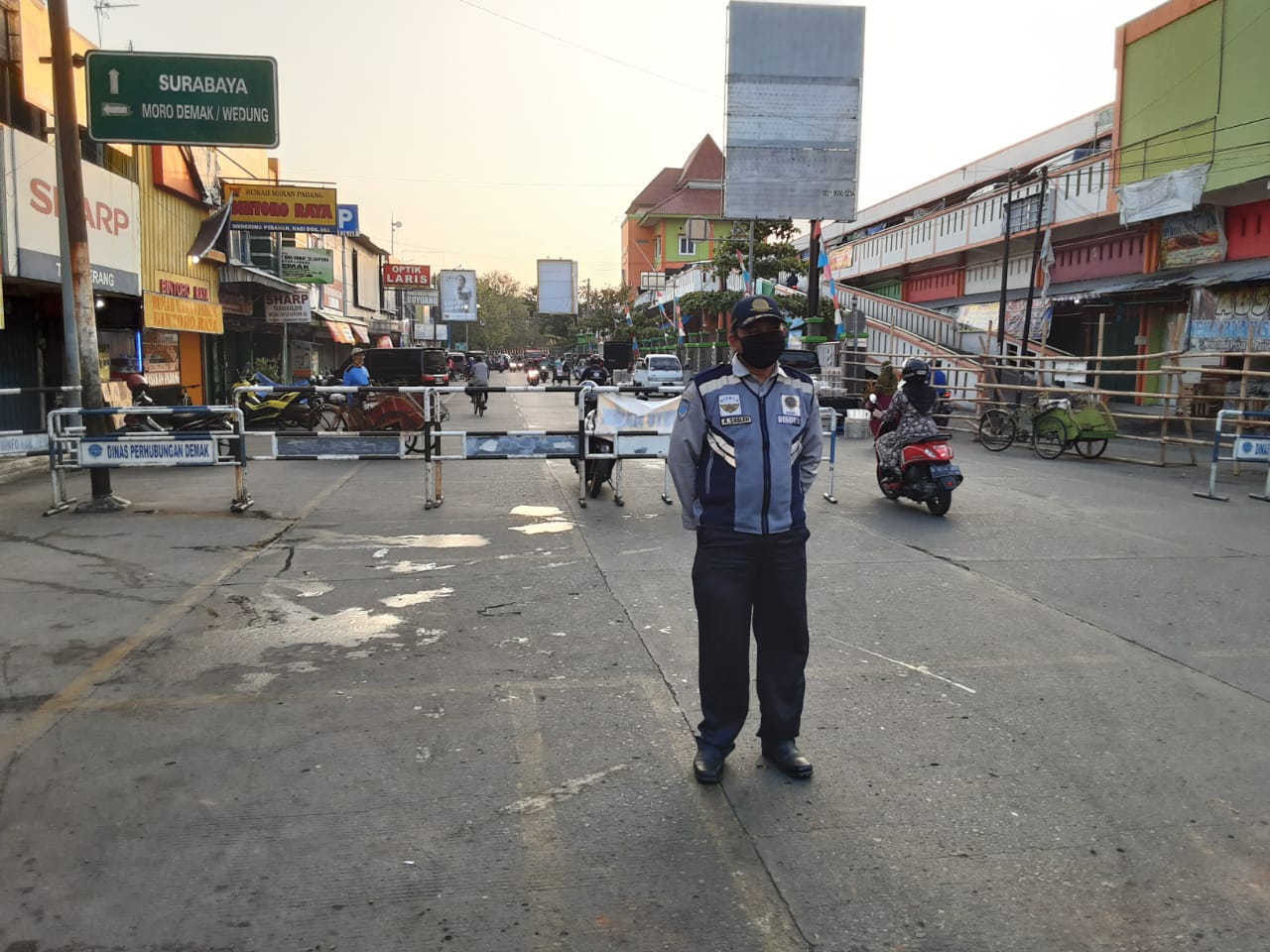 Personil Dinas Perhubungan kabupaten Demak melaksanakan giat penutupan jalan untuk emmberikan akses kepada pedangang untuk memjual daganganya di jalan raya dengan sistem protokol kesehatan Covid -19. (rabu, 22/7/20).