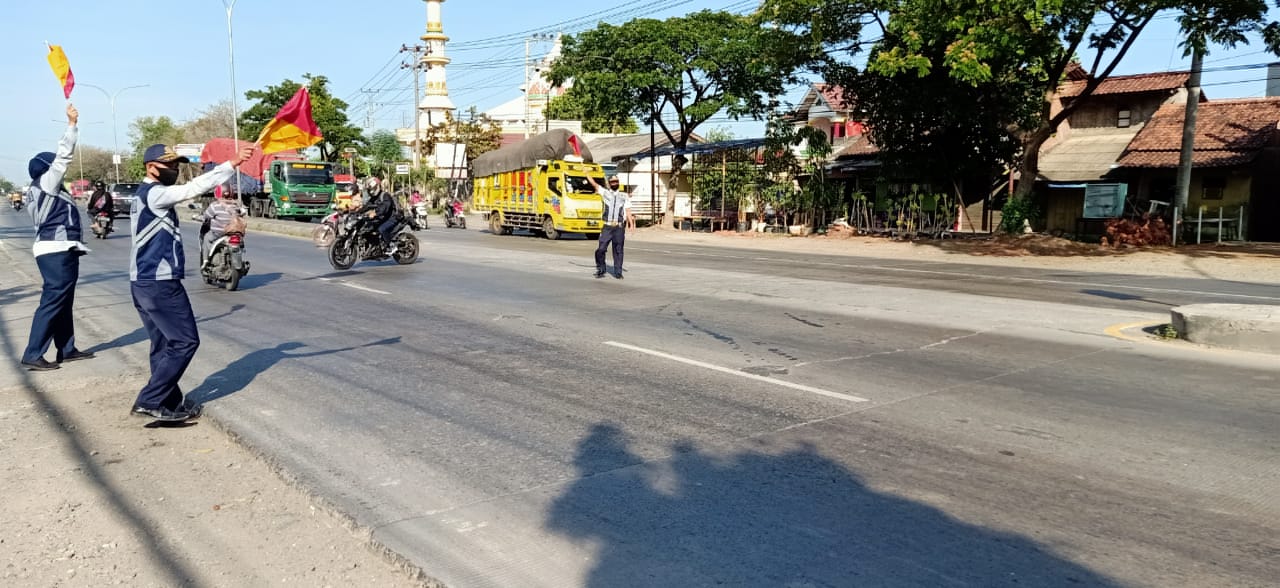 Seperti pada pagi (6/10/2020) terlihat personel membantu menyeberangkan masyarakat dipersimpangan jalan. Dimana kegiatan masyarakat dimulai pada waktu yang bersamaan, pada pagi hari jam kerja bagi karyawan pemerintah maupun swasta dan anak-anak sekolah pada pagi hari di sepanjang jalan depn kantor dinas perhubungan selalu dipadati dengan arus lalu lintas.