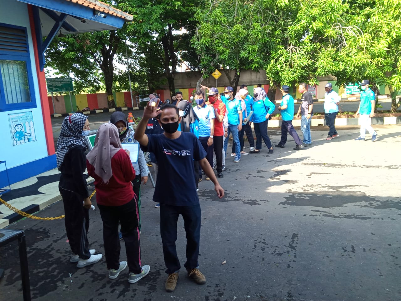 Mereka melakukannya dengan cara merentangkan tangan dengan jarak satu meter kepada jajaran Personil Dinhub serta di wajibkan menggunakan Masker kain untuk meminimalisir penyebaran Virus Corona ( Covid-19 ).