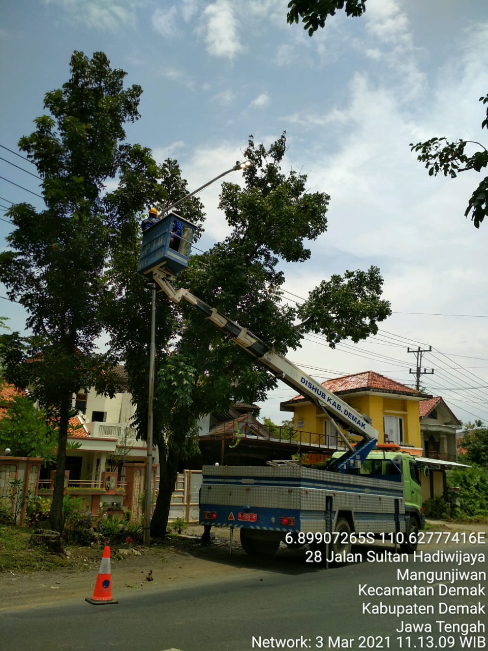 Dinas Perhubungan (Dishub) melakukan perbaikan lampu penerangan jalan umum (PJU) di Kec. Demak Kota yang mengalami kerusakan setelah mendapati adanya laporan daerah tersebut penerangan jalan umum (PJU) padam.