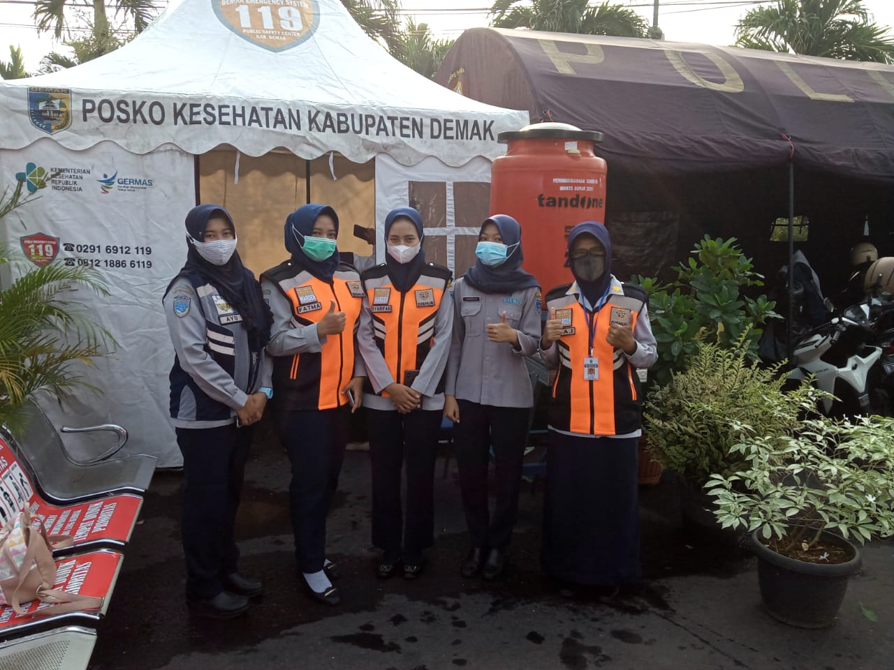 Anggota Dinas Perhubungan Kab. Demak melaksanakan giat Pengamanan Posko Mudik Lebaran pencegahan Covid-19, yang berlokasi di Wilayah terminal Bintoro demak, Kamis (6/05/2021)